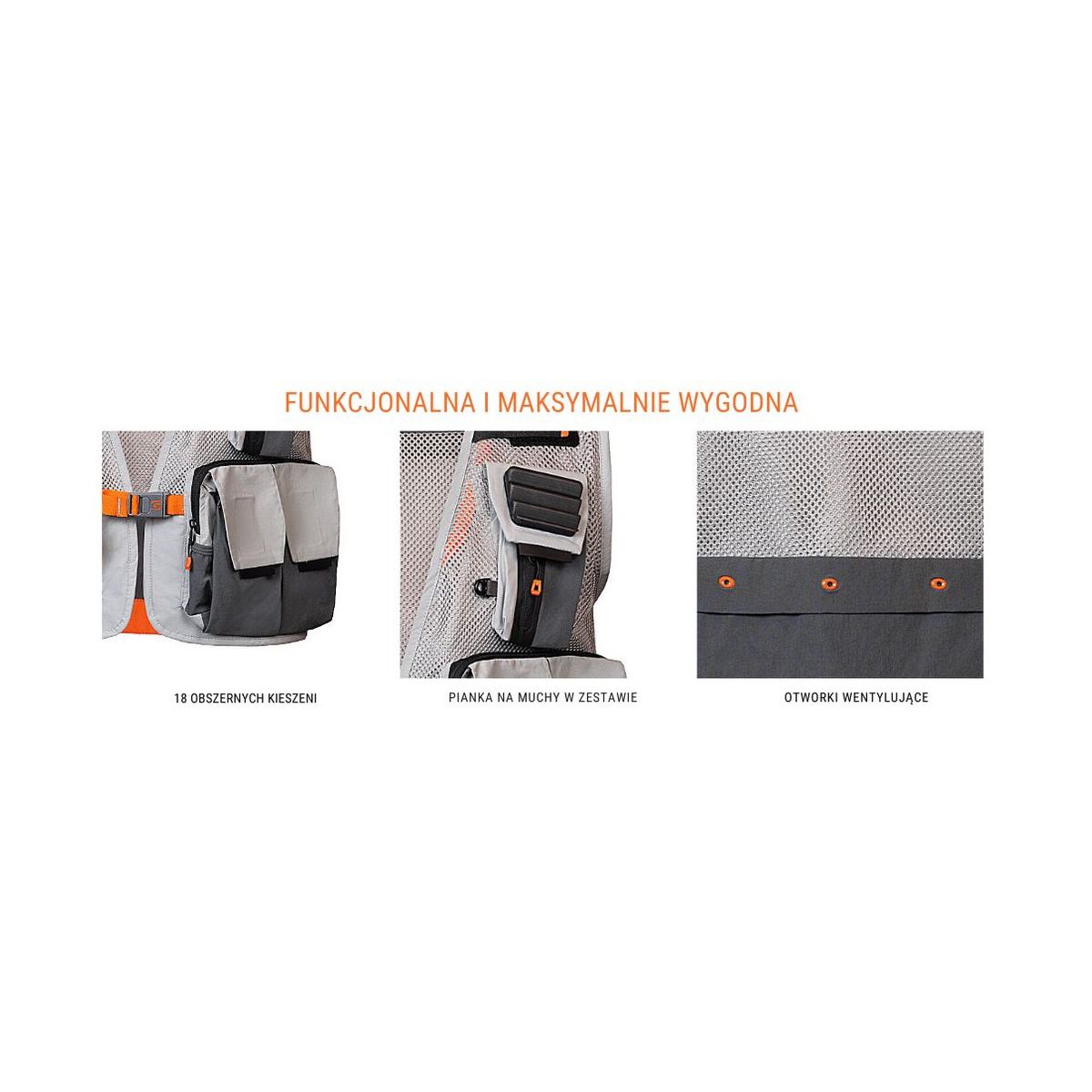 Specialiai sukurtas kirpimas ir tampraus audinio naudojimas daro liemenę itin patogią, užtikrinant komfortą net ir ilgomis naudojimo valandomis. Liemenėje yra 18 įvairių tipų kišenių, todėl joje tilps visi svarbiausi jūsų žvejybos reikmenys. Tamprus audinys leidžia laikyti įvairių tipų ir formų daiktus, padeda tolygiai paskirstyti apkrovą ir išlaikyti visišką funkcionalumą.